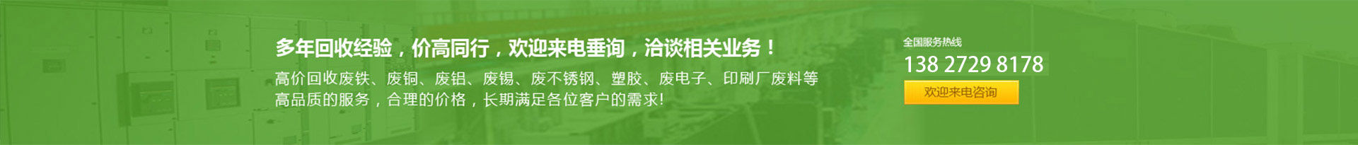 • 專業從事回收廢銅(tóng),廢鋁,廢鋅,廢鐵,廢塑膠,廢錫,貴金屬、電(diàn)子元件等各種(zhǒng)各樣廢舊物資回收